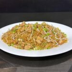Buco arroz frito de 650 gramos, acompañado de tiernos trozos de pollo y sazonado con cebollín fresco.