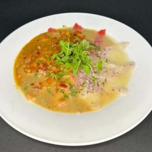 Sopa cremosa de camarones con maíz, papas y una variedad de vegetales. Un plato reconfortante y lleno de sabor, perfecto para los amantes de los mariscos.