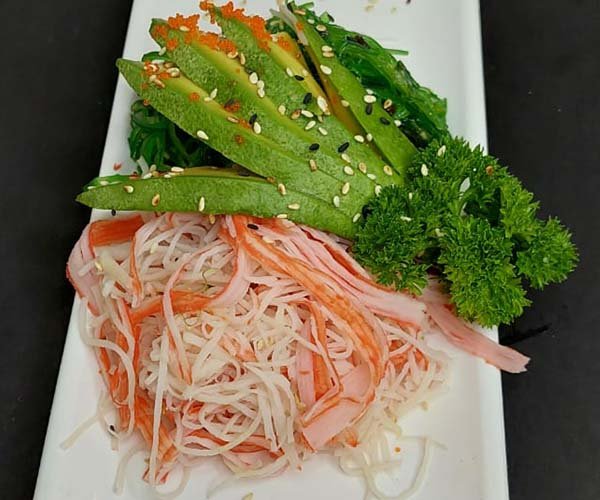 Hilos de cangrejo (kani) aderezado con salsa Dragon (picante), acompañado de aguacate