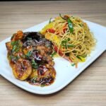 Pollo, carne y camarón en salsa teriyaki, acompañados de yakimeshi. Un plato equilibrado que combina sabores intensos y texturas variadas, perfecto para disfrutar lo mejor de la cocina teppanyaki.