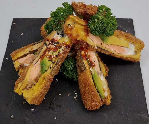 Finas láminas de plátano, rellenas de queso crema, aguacate y salmón tempurizados. Acompañado de salsa dinamita.